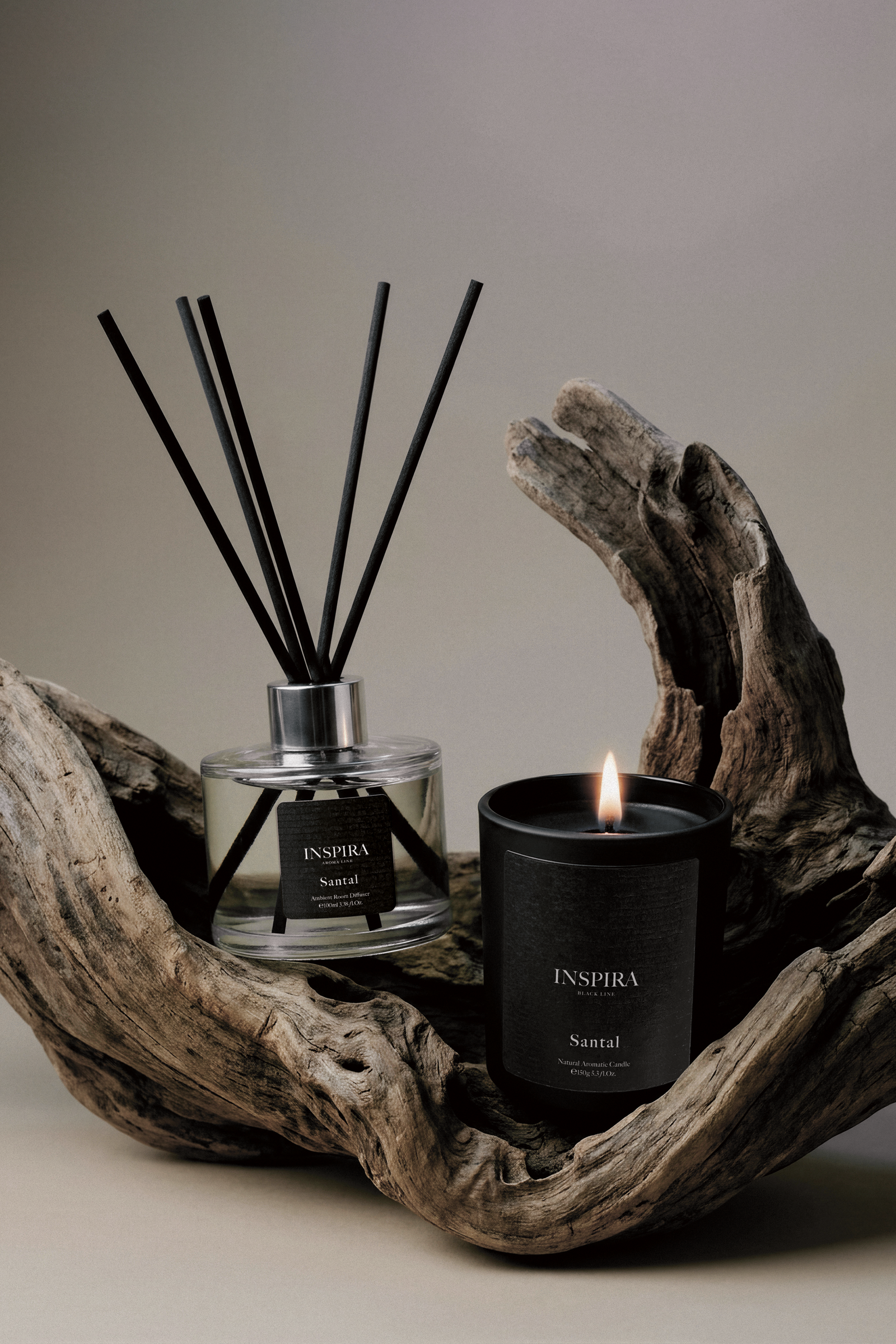 Głębokie czarne matowe szkło, czarny wosk oraz etykieta o prążkowanej fakturze tworzą spójny, nasycony wizualnie charakter. Prostota formy i wizualna głębia nadają świecy wyrazistości, czyniąc ją akcentowym elementem przestrzeni.